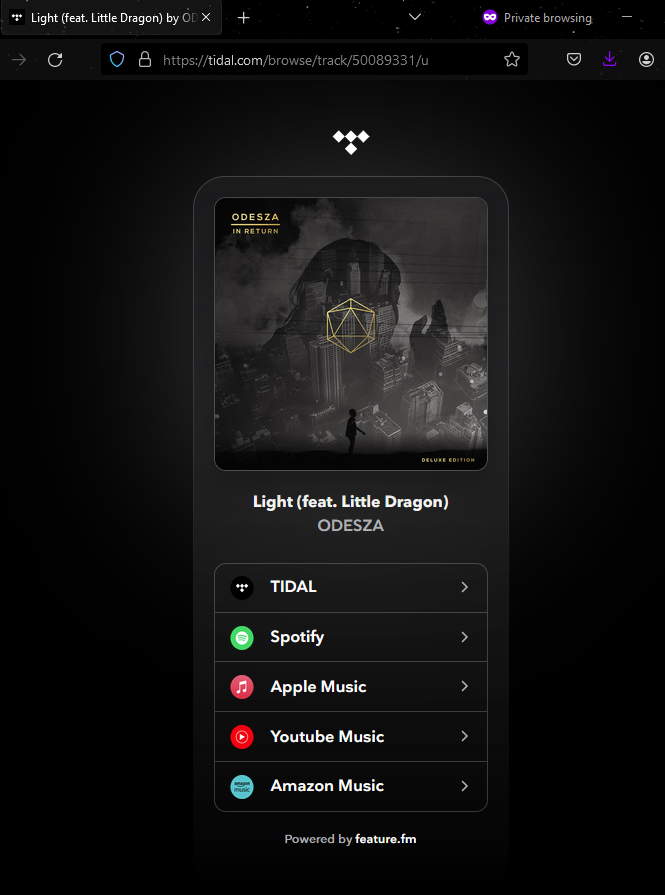Tidal’s new and improved “share” button states “Listen to Song name on your streaming service” but provides a link that opens in a browser to Tidal’s site. From there, the end user can select if they want to open the song in another service. This feature is powered by “Feature.fm” Feature.fm offers an API integration, allowing this sharing to happen automatically.